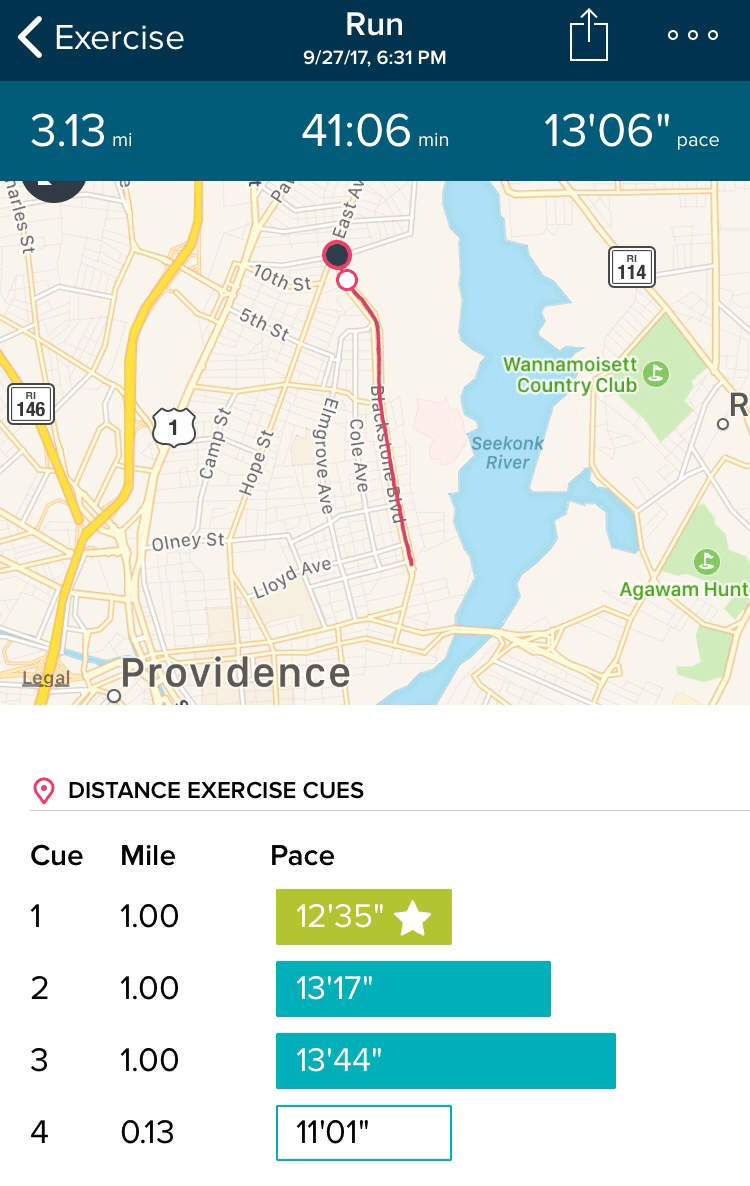 Since finishing BRG, most of my runs have been solo. I was heading to Rhode Runner for their Wednesday evening runs but fell out of the habit. (Mental note: get your butt back to Rhode Runner on Wednesdays.) Each Sunday, I look at the weather forecast and map out the afternoons best for running. The night before, I pack my running clothes in what has become my running bag and place it next to my school bag. After school, I change my clothes and head for the Boulevard. I am able to beat the worst of downtown traffic, pick Liam up from school, and still make it home before Mike. These runs are peaceful but sometimes lonely.