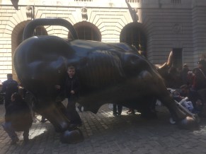 By Sunday, we were exhausted. We went downstairs to eat breakfast, then went back to our room until checkout, watching The Discovery Channel and lounging. When it was time to leave, we headed one last time down to Battery Park and wandered around. We discovered a cookie spot that offers warm cookie delivery until 3am! I am a suburban girl at heart, but knowing I could have warm cookies brought to me at all hours of the night might make me rethink my position about cities. We tried our best to explain Wall Street and the Stock Exchange to Liam. While he didn’t fully comprehend the significance, he was happy to see the bull. We stopped to visit Hamilton’s grave.