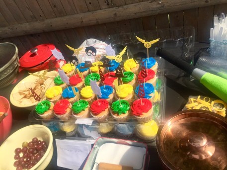 My only real goof-up involved the cake. I assumed I could order a cake from Stop and Shop a week before the party. I was wrong; they no longer carry the cake kit. Walmart does not have Harry Potter cakes, either. After Googling “easy Harry Potter cakes” for a while, I decided to order cupcakes from Stop and Shop and cake decorations from Amazon. It worked out just fine.