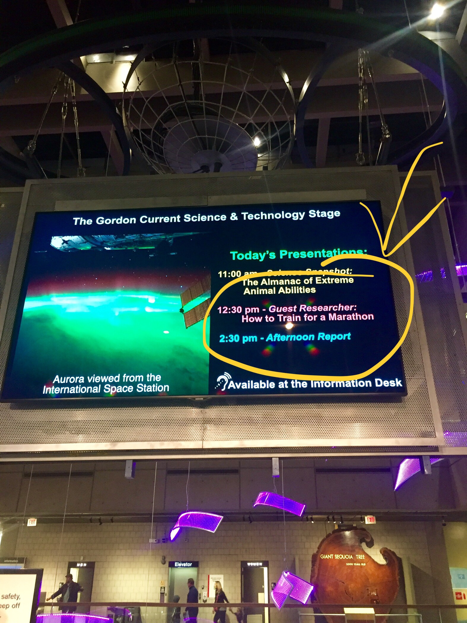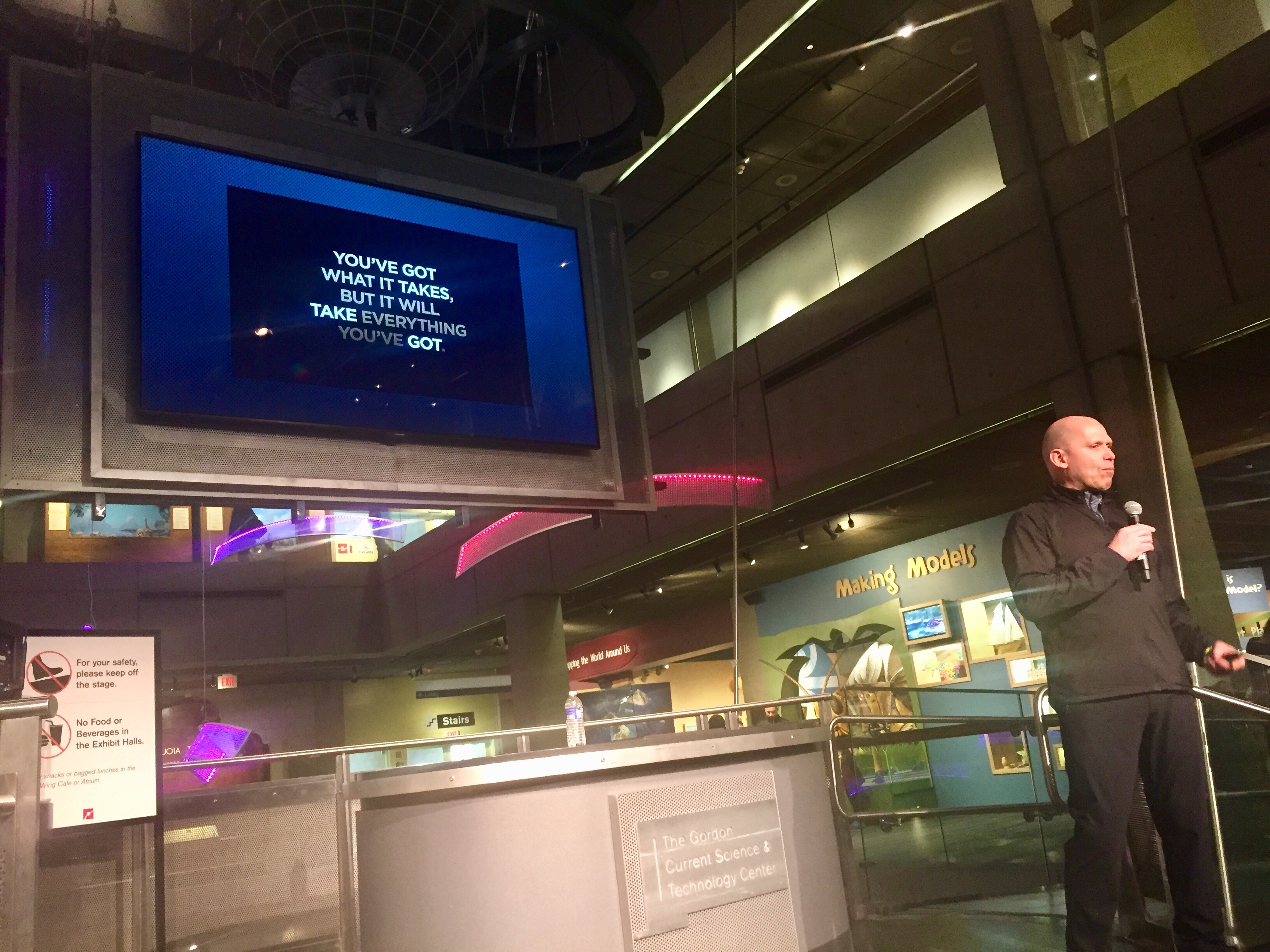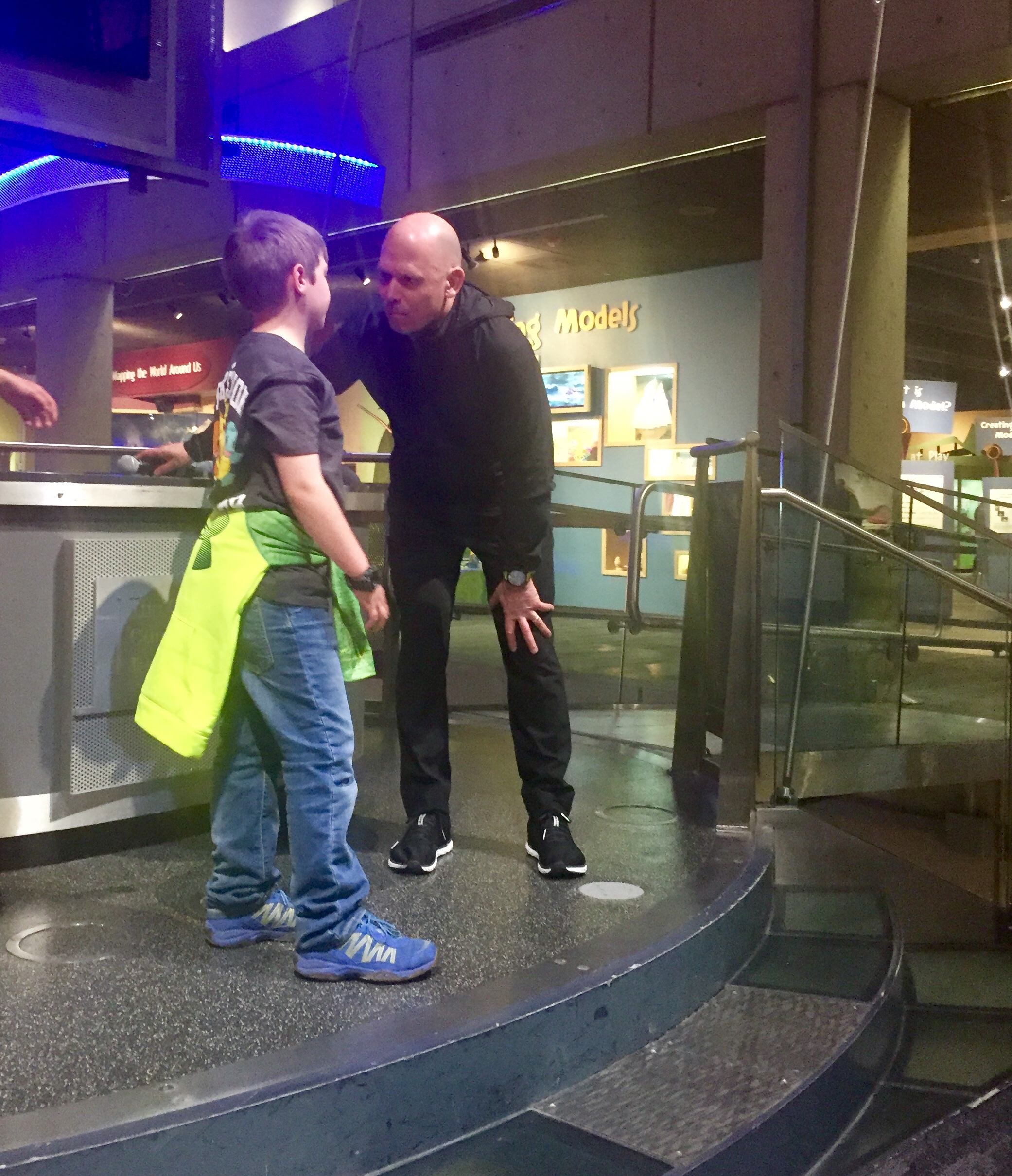 Today, we took Liam to the Boston Museum of Science, his reward for a stellar report card. Because the Boston Marathon is next week, they were offering a bunch of marathon-related activities. Liam was able to learn how bib chips work. I was excited to see a presentation called “How to Train for a Marathon.” When we went back to the area for the session, the gentleman leading the session, Rick Murh, was there and came over the chat.